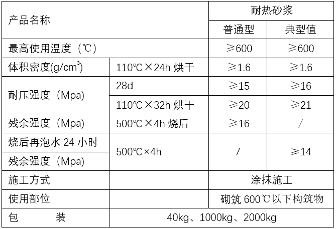 這就要求用于砌筑體的砌縫材料在常溫下既具有一定的抗壓強(qiáng)度,又能長(zhǎng)期耐受600℃以下的溫度。在這種情況下,耐火泥由于在常溫下不具有強(qiáng)度而無法滿足砌筑需求,普通砂漿由于在600℃的溫度下容易產(chǎn)生裂縫、粉化甚至爆裂而無法使用。因此,需要一種常溫下抗壓強(qiáng)度不小于10Mpa,且在工作溫度低于600℃的條件下其抗壓強(qiáng)度也不小于10Mpa的耐熱砂漿類產(chǎn)品填補(bǔ)這一技術(shù)空白。
